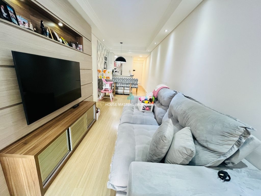 Sala 2 ambientes com varanda gourmet, envidraçada e equipada com churrasqueira elétrica.